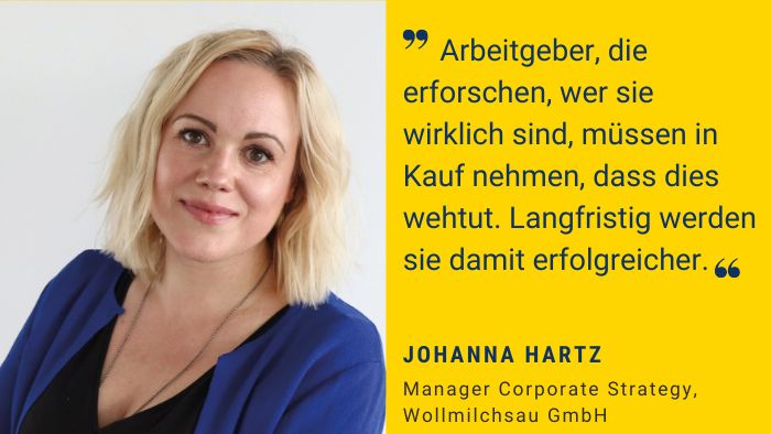 Arbeitgeber, die erforschen, wer sie wirklich sind, müssen in Kauf nehmen, dass dies wehtut. Das betont Johanna Hartz. Denn, so prophezeit die Employer-Branding-Expertin, sie werden auf Lücken stoßen zwischen dem, wer sie sein wollen, und dem, wie ihr Unternehmen tatsächlich tickt. „Welche Kultur herrscht? Welche Werte werden gelebt? Und wie wird miteinander umgegangen? Unternehmen, die bei dieser Analyse richtig hinschauen, werden nicht nur vorfinden, was ihnen gefällt“, erläutert Hartz. Allerdings liege hier auch einer der Knackpunkte: zu erkennen und dazuzustehen, dass man als Arbeitgeber immer auch Ecken und Kanten habe.