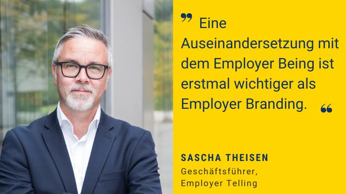 Wozu dies führt, schildert Sascha Theisen, Geschäftsführer von Employer Telling: „Im Grunde genommen haben wir es mit austauschbaren Arbeitgebern zu tun, denn alle arbeiten mit den gleichen Floskeln: leidenschaftliche Kollegen, flache Hierarchien, attraktives Gehalt et cetera.“ Im Produktmarketing müsste jeder, der solche Austauschbarkeit zu verantworten habe, seinen Hut nehmen, ist Theisen überzeugt. „Es braucht einen anderen Ansatz im Employer Branding, als er in den vergangenen 15 bis 20 Jahren gelebt wurde. Dafür müssen differenzierende Inhalte zunächst geschaffen und praktiziert werden. Erst dann können sie kommuniziert werden“, sagt er. Eine Auseinandersetzung mit dem „Employer Being“ sei daher erstmal wichtiger als Employer Branding. Das heißt, dass die Unternehmen im ersten Schritt reflektieren sollten, wer und wie sie als Arbeitgeber eigentlich sind.