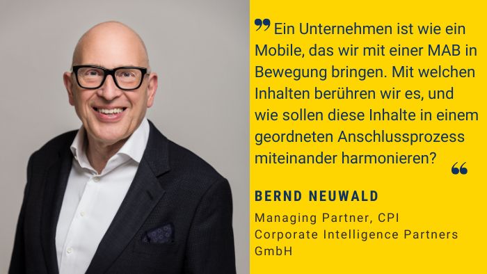 Bernd Neuwald, Managing Partner bei der CPI Corporate Intelligence Partners GmbH, vergleicht ein Unternehmen mit einem Mobile, das man per MAB antickt und in Bewegung bringt. „Mit welchen Inhalten berühren wir es, und wie sollen diese Inhalte in einem geordneten Anschlussprozess miteinander harmonieren?“, beschreibt er und empfiehlt, jeden Auftrag vorab sorgfältig zu klären. „Eine systemische, umfassende Perspektive über den Gesamtprozess ist ein wichtiger Punkt, den man mit dem Kunden möglichst gut abklären soll.“ Dazu gehören auch ungeplante Szenarien, die den Anschlussprozess negativ beeinflussen könnten. Was passiert beispielsweise, wenn plötzlich nur noch 40 Prozent der Ressourcen zur Verfügung stehen? Oder welchen Einfluss hätte ein Vorstandswechsel?