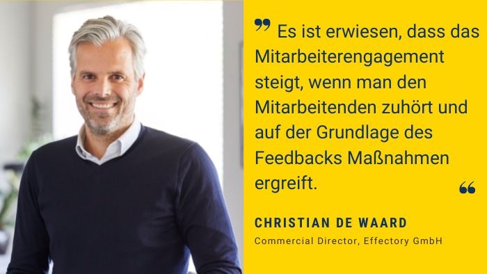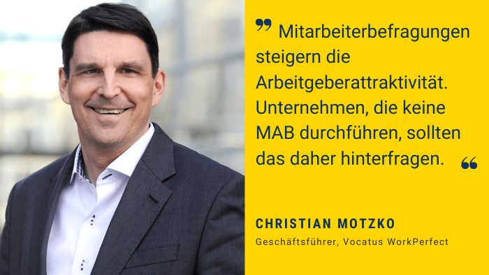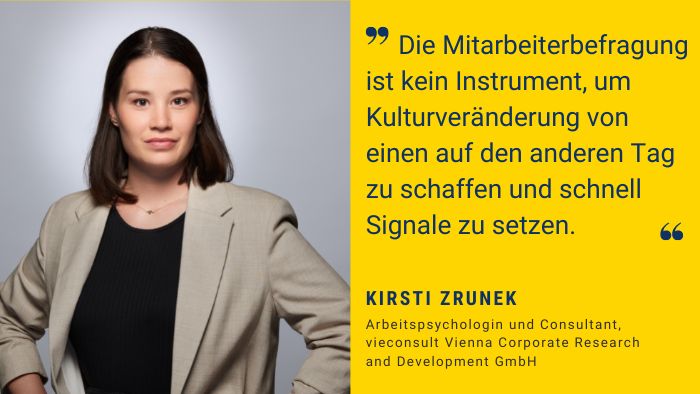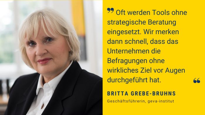 Auf jeden Fall auch dürfen die Befragungen nicht zum Selbstzweck verkommen und die Mitarbeitenden sich durch sie eher kontrolliert denn begleitet fühlen. Dann nämlich verspielt man sich die Chance, mittels Befragungen als Mitarbeiter-Dialoginstrument Mitarbeitende an sich zu binden.