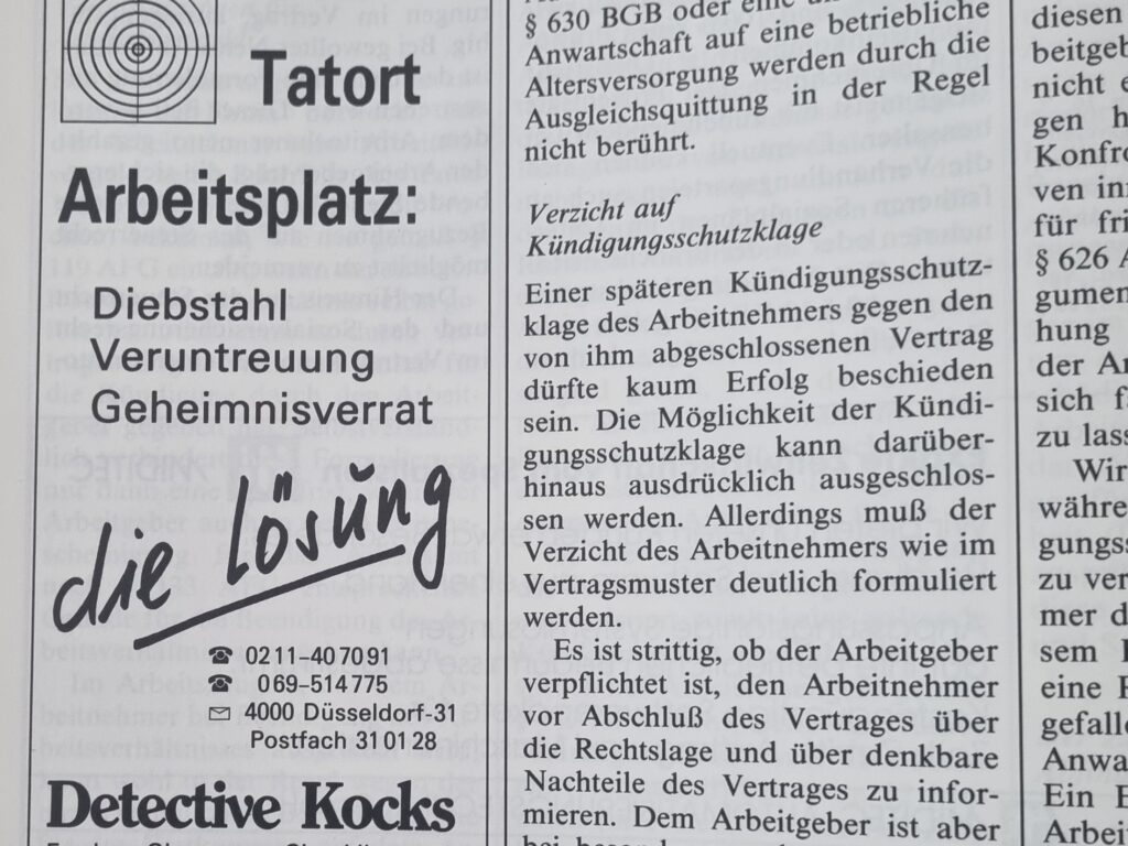 Zwischen Werbung für Führungskräfteseminare, Zeitarbeitsfirmen, HR-Software und Stellenanzeigen geht die Anzeige des Düsseldorfer Detektivbüros Kocks fast unter: Um Diebstahl, Veruntreuung und Geheimnisverrat am „Tatort Arbeitsplatz“ auf die Spur zu kommen, möge man sich vertrauensvoll an „Detective Kocks“ wenden. Nicht überliefert ist, ob das Zielscheibenlogo in der Anzeige, dass doch sehr an die erfolgreichste TV-Krimireihe Deutschlands erinnert, für eine Copyright-Klage sorgte. Die inzwischen eingedeutschten „Detektive Kocks“ bieten ihre Dienste übrigens auch heute noch an.