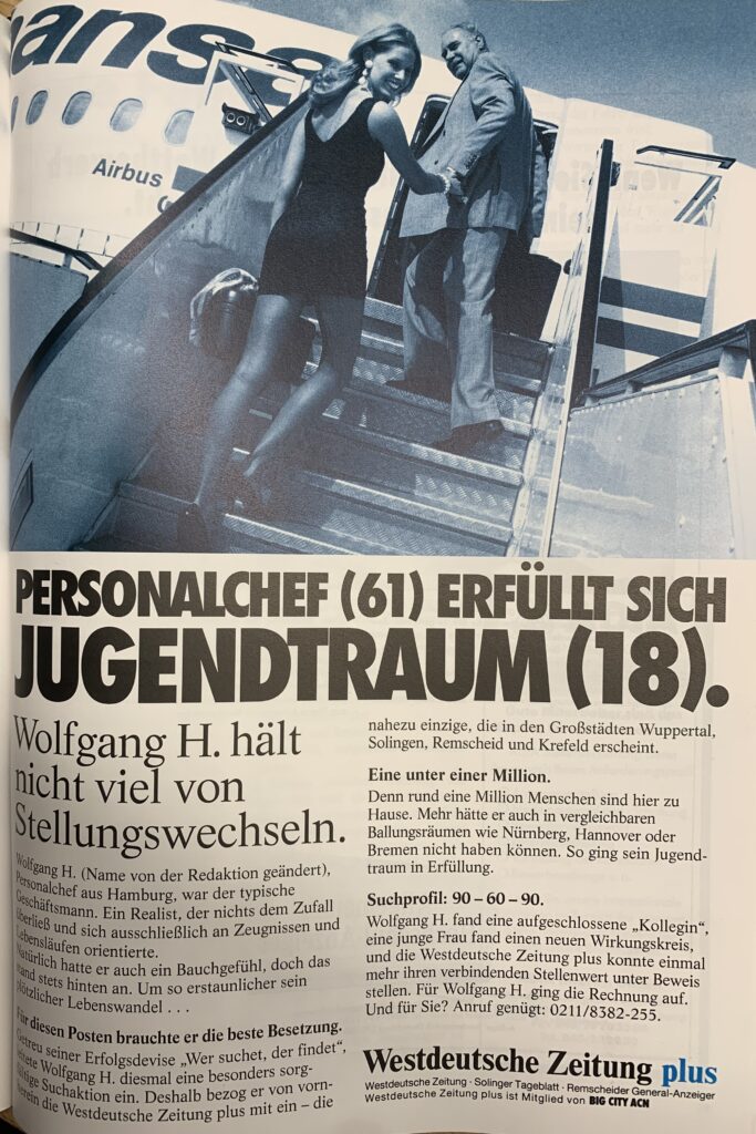 Diese Anzeige ist Teil einer reißerischen Kampagne der Westdeutschen Zeitung für den Stellenmarkt. Unglaublich, aber wahr. Nicht witzig, sondern sexistisch. Heute würde so eine Anzeige glücklicherweise nicht mehr geschaltet – und von der Redaktion auch nicht geduldet.