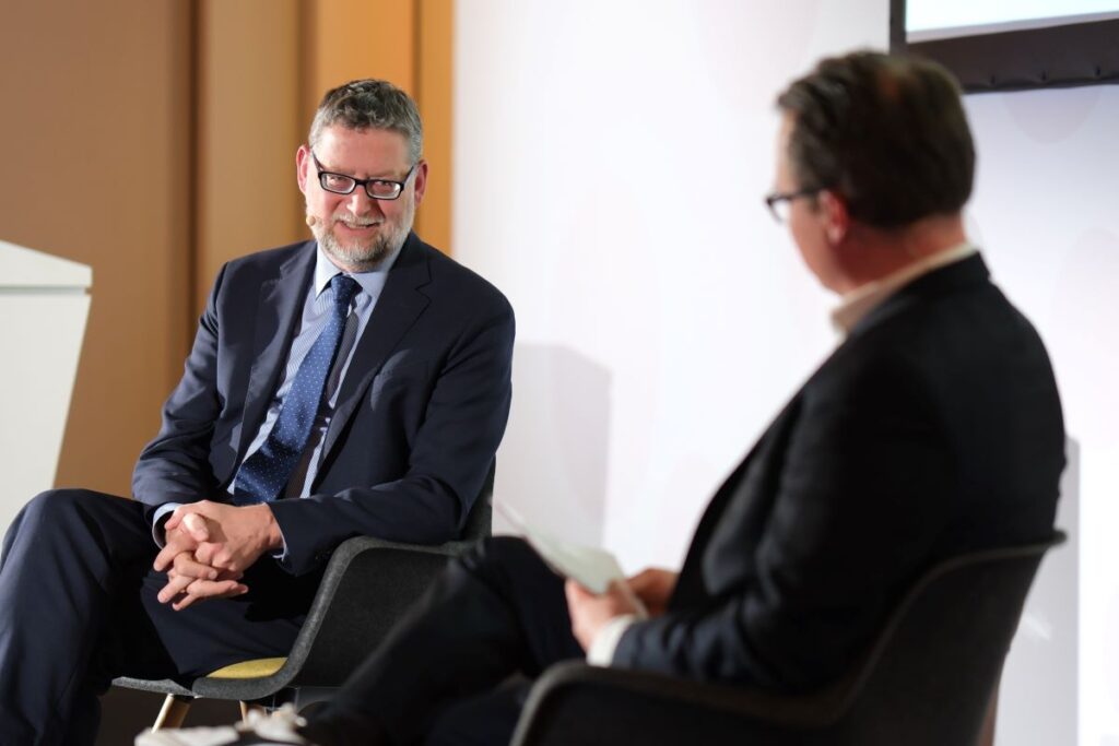 Thorsten Schäfer-Gümbel (links), Vorstandssprecher und Arbeitsdirektor der Deutschen Gesellschaft für Internationale Zusammenarbeit,und Matthias Schmidt-Stein, Redaktionsleiter Personalwirtschaft Online, gingen mit den Gästen ins Gespräch über die internationale Fachkräftegewinnung. (Foto: Dirk Beichert BusinessPhoto)