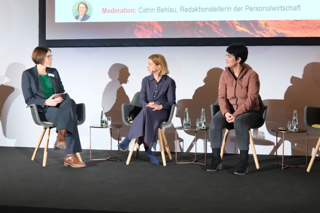 Catrin Behlau, Redaktionsleitung Personalwirtschaft, ist mit Sabine Mlnarsky, CHRO von der Commerzbank (Mitte), und Aki Arraéz Ramon, Vice President People & Culture bei Jack Wolfskin (links), in eine Podiumsdiskussion gegangen. (Foto: Dirk Beichert BusinessPhoto)