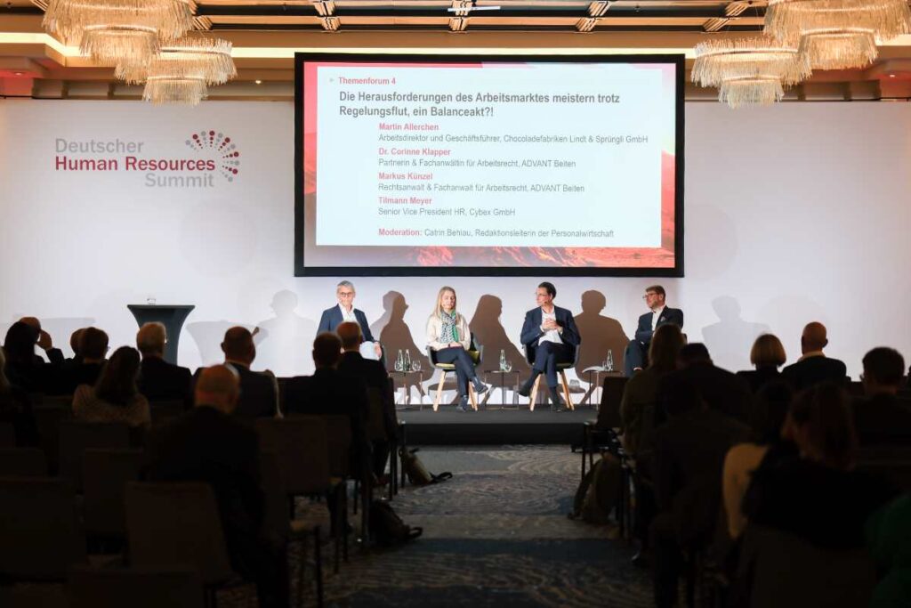 Bei all den Bemühungen müssen sich Arbeitgeber natürlich ans Gesetz halten. Und dieses wurde vom Gesetzgeber jüngst hinsichtlich der Fachkräfteeinwanderung geändert. Was zukünftig gelten wird, stellten Markus Künzel und Corinne Klapper – beides Partner und Fachanwälte bei Advant Beiten –vor. Sie tauschten sich zudem auf der Bühne mit Martin Allerchen, Arbeitsdirektor und Geschäftsführer bei Chocoladefabriken Lindt & Sprüngli, und Tilllman Meyer, Senior Vice President People & Culture von Goodbaby International, über ihre Erfahrungen mit internationalem Recruiting aus. Bei Lindt arbeiten Menschen aus rund 87 Nationen in der Produktion, berichtete Allerchen. Das größte Problem sei die sprachliche und kulturelle Integration der ausländischen Mitarbeitenden. Das müsse gelöst werden, um das Potenzial von Fachkräften aus dem Ausland zu nutzen. Gleichzeitig plädierte der Lindt-Arbeitsdirektor dafür, dass Politik und Wirtschaft einen besseren Überblick darüber bräuchten, welche Qualifikationen nach Deutschland geflüchtete Menschen haben. Meyer sieht hingegen die Bürokratie als größtes Hindernis für eine erfolgreiche Fachkräfteeinwanderung.