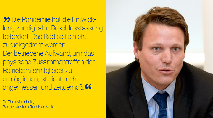 Die Corona-Ausnahmesituation hat der Entwicklung zur digitalen Beschlussfassung einen starken Schub gegeben. Mit dem Auslaufen der Sonderregelung das Rad wieder zurückzudrehen, wäre falsch, urteilen die Juristen. Der Aufwand, Betriebsratsmitglieder für Sitzungen des Betriebsrats physisch zu versammeln, sei weder zeitgemäß noch angemessen und notwendig Es könne nicht sein, dass Betriebsräte durch ganz Deutschland reisen müssten, um eine Vereinbarung zu verabschieden. Allerdings sei es notwendig, die Sonderregelung im Betriebsverfassungsgesetz noch weiter zu bearbeiten, sodass dass auch die Wahl eines Freigestellten in geheimer Form erfolgen könne.