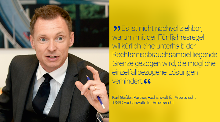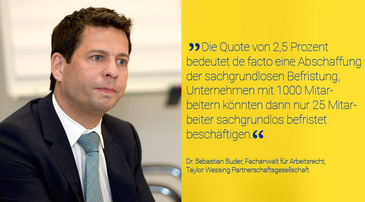 Der Anteil sachgrundloser Befristungen soll bei Arbeitgebern mit mehr als 75 Beschäftigten in der Privatwirtschaft und im öffentlichen Dienst auf 2,5 Prozent der Beschäftigten beschränkt und die Höchstdauer sachgrundloser Befristung von bisher 24 auf 18 Monate verkürzt werden. Auch Befristungen mit Sachgrund sollen auf eine Höchstdauer von fünf Jahren beschränkt werden. Was heißt das in der Konsequenz für Arbeitgeber? Der administrative Aufwand vor allem für die Ermittlung des Schwellenwerts dürfte enorm sein. Durch die Erhöhung der Bürokratie soll ein stillschweigendes Ende der sachgrundlosen Befristung eingeläutet werden, kritisieren die Arbeitsrechtler. Auch bezweifeln sie, dass die sachgrundlose Befristung durch das Angebot eines unbefristeten Arbeitsvertrages ersetzt wird. Stattdessen würden Arbeitgeber verstärkt auf Zeitarbeit setzen.