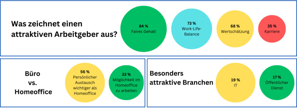 Ganz besonders wichtig bei der Wahl des Arbeitgebers ist über alle Altersgruppen hinweg ein faires Gehalt, sowie eine ausgeglichene Work-Life-Balance. Darüber hinaus spielt die Wertschätzung durch Kollegen und Arbeitgeber für die deutschen Arbeitnehmer eine wichtige Rolle. Deutlich weniger relevant für die Jobwahl ist dagegen die Aussicht auf berufliches Fortkommen: Karriere (35 Prozent), Weiterbildungsmöglichkeiten (31 Prozent) und Gestaltungsspielraum (29 Prozent) rangieren auf den hinteren Plätzen. Obwohl Homeoffice heute allgegenwärtig ist, ist es für die Mehrheit kein entscheidendes Merkmal für einen attraktiven Arbeitgeber. Denn mehr als die Hälfte der Befragten gibt an, gerne vor Ort zu arbeiten, weil ihnen die persönliche Zusammenarbeit und der persönliche Austausch wichtig sind.