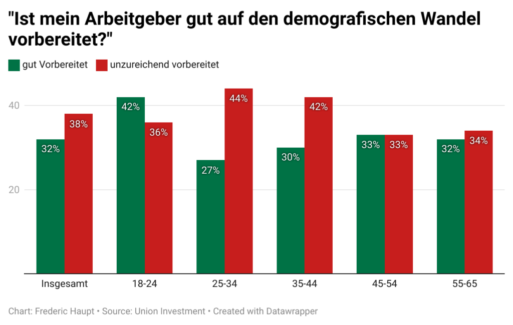 Arbeitnehmerinnen und Arbeitnehmer in Deutschland spüren die Folgen des demografischen Wandels. Dieser ist längst kein theoretisches Szenario mehr, sondern im Alltag vieler Unternehmen angekommen. Eine Studie von Union Investment zeigt nun: Knapp vier von zehn Beschäftigten hierzulande nehmen bereits die Auswirkungen einer alternden Gesellschaft am Arbeitsplatz wahr. Genauso viele rechnen damit, dass sich die Folgen in den kommenden fünf Jahren verschärfen werden. Außerdem haben Arbeitgeber den Arbeitnehmenden nach zufolge noch Hausaufgaben im Punkt der Vorbeugung von schlechten Folgen des demografischen Wandels vorzubeugen, zu erledigen. Insbesondere die Altersgruppe der 25- bis 34-Jährigen sieht zudem den eigenen Arbeitnehmer nicht gut auf die Herausforderungen des demografischen Wandels vorbereitet.