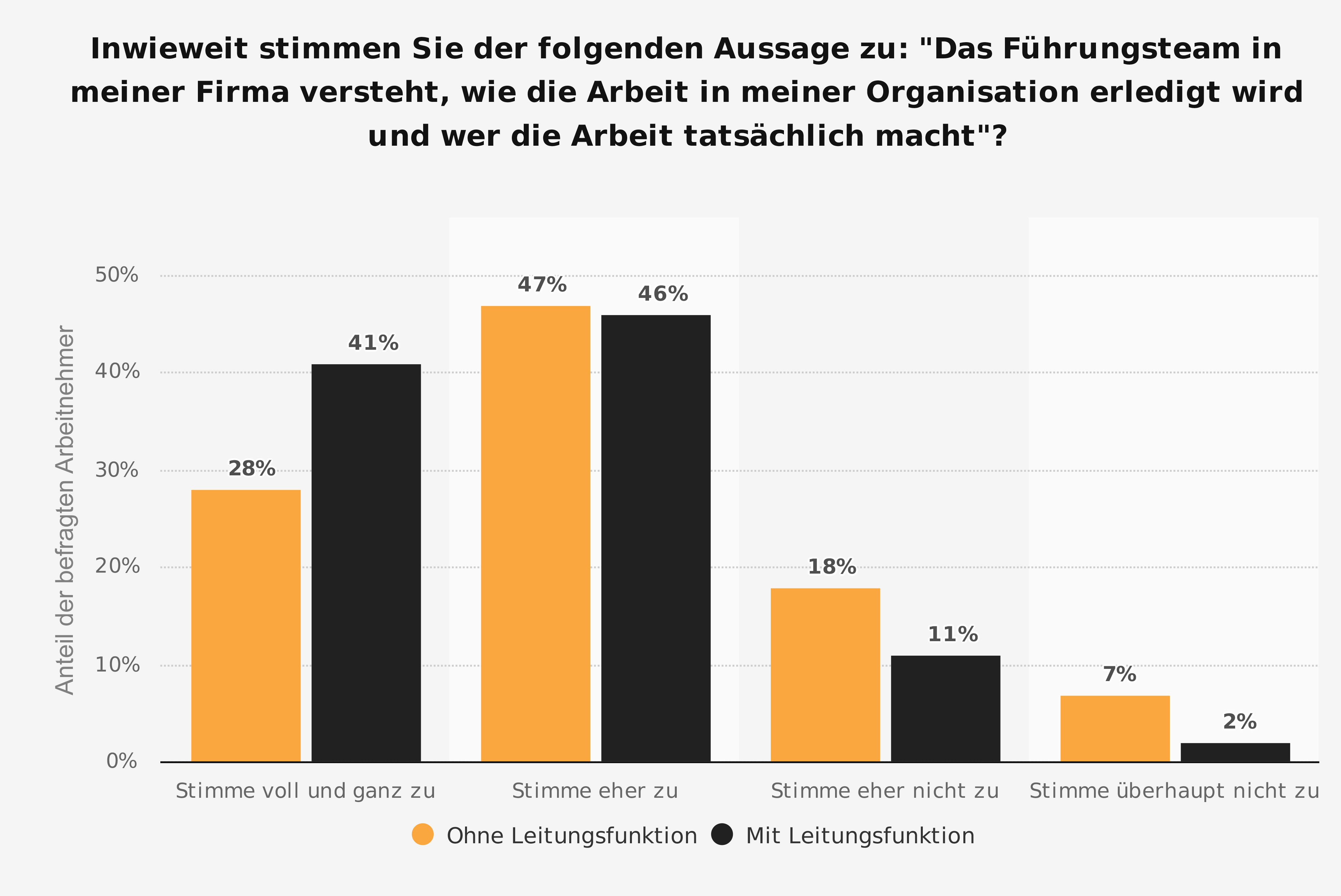 Nur etwa die Hälfte der Befragten – sowohl mit als auch ohne Leitungsfunktion – sind der Meinung, dass das Management-Team tatsächlich weiß, welche Arbeit die einzelnen Abteilungen und Mitarbeiter wirklich leisten.