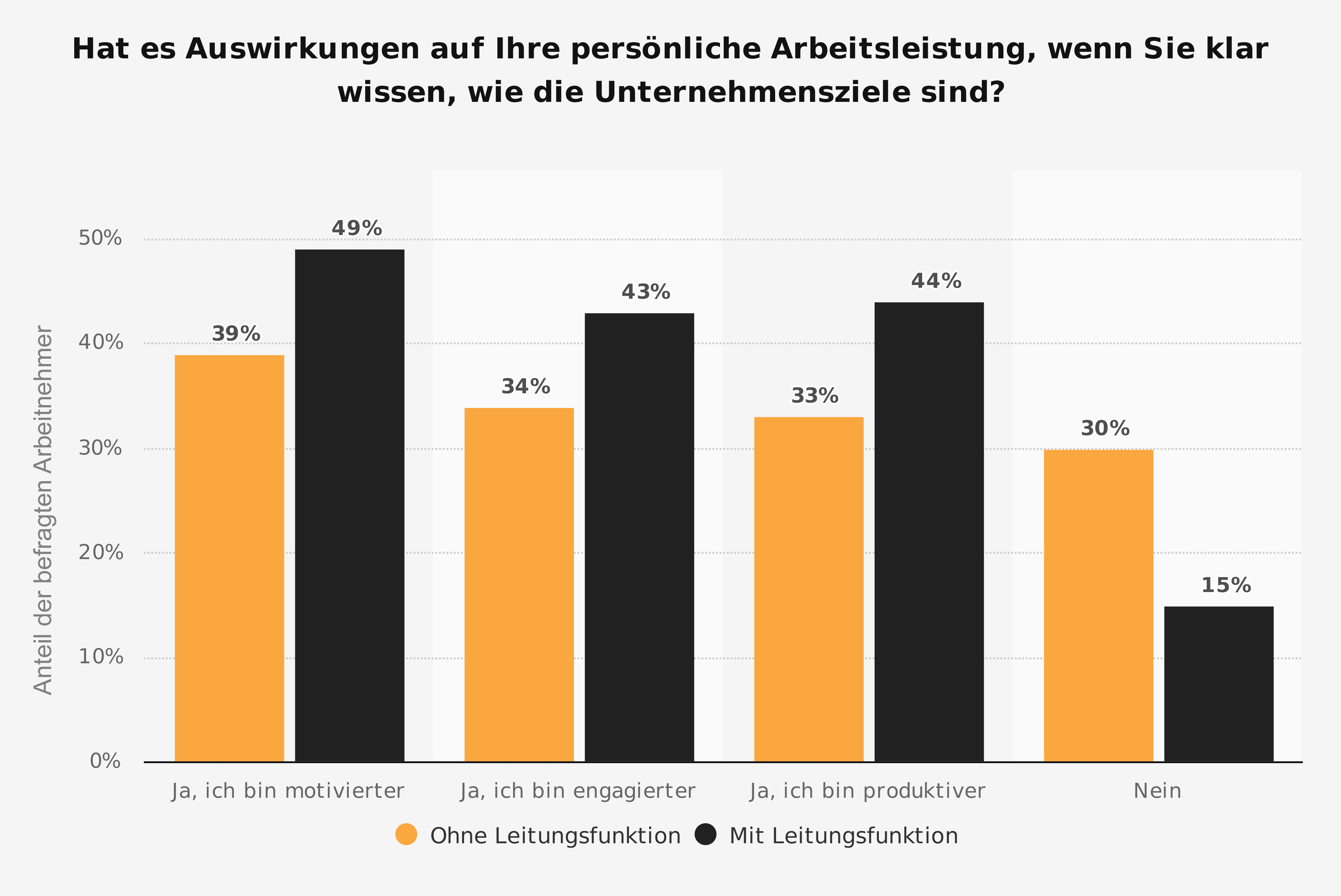 Fakt: Das Verständnis von Zielen wirkt sich laut 43 Prozent der Befragten deutlich auf die Motivation von Mitarbeitern aus. Auch Produktivität und Engagement wachsen, wenn Mitarbeiter die Unternehmensziele kennen. Das sagen 36 Prozent beziehungsweise 37 Prozent der Befragten.