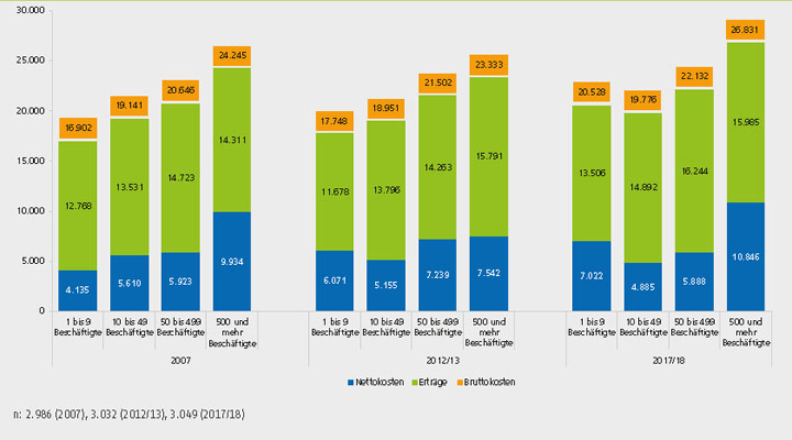 Insgesamt sind die Nettokosten zwischen den Ausbildungsjahren 2012/13 und 2017/18 nur gering gestiegen. Die höheren Bruttokosten können zum Teil damit erklärt werden, dass die Löhne der an der Ausbildung beteiligten Fachkräfte angehoben wurden.