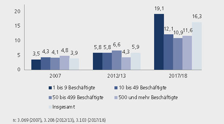 Im Jahr 2007 dauert der Suchprozess bei Kleinstbetrieben noch 3,5 und bei Großbetriebe 4,8 Wochen. Vor allem zwischen den Jahren 2012/13 und 2017/18 hat sich die Dauer mehr als verdoppelt, bei Kleinstbetrieben sogar mehr als verdreifacht.