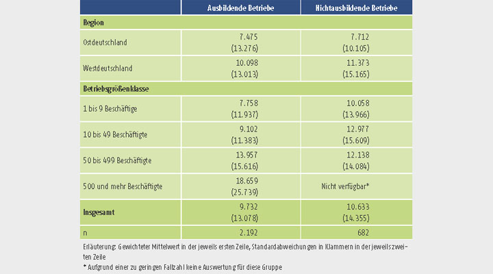Von den Bruttokosten können die Erträge der Auszubildenden, die sie bereits im Betrieb erwirtschaften, abgezogen werden. Die Befragten gaben als Erträge durchschnittlich 14 377 Euro pro Jahr an. Als Ausgaben unterm Strich stehen also im Durchschnitt 6478 Euro netto pro Jahr und Auszubildendem. Bei knapp einem Drittel der Auszubildenden übersteigen die erwirtschafteten Erträge die Bruttokosten, das heißt, sie erbringen über die Investitionen hinaus einen Mehrwert für ihre Betriebe.