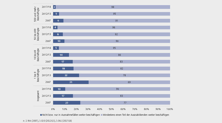 Die deutliche Mehrheit der Betriebe will einen Teil der Aus¬zubildenden oder sogar alle nach den Abschlussprüfungen weiter beschäftigen. In den letzten zehn Jahren hat sich der Prozentsatz derjenigen, die ihre Azubis nicht übernehmen wollen, bei Betrieben jeder Größenordnung deutlich verringert. So planen heute nur vier beziehungsweise zwei Prozent der mittleren und großen Ausbildungsbetriebe, die jungen Menschen nicht zu übernehmen.