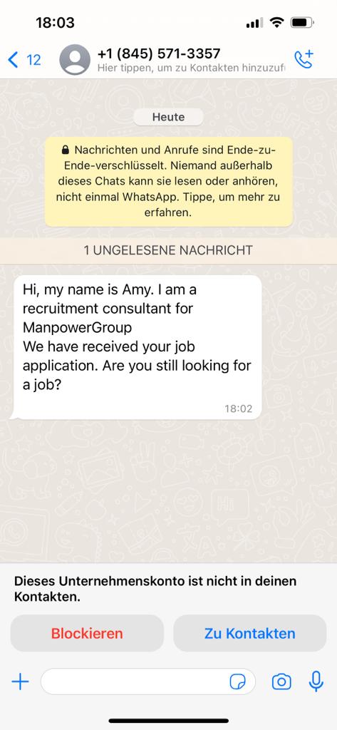 „I’m a recruitment consultant for ManpowerGroup. We received your job application. Are you still looking for a job?“ Was auf den ersten Blick wie ein positives Feedback im Bewerbungsprozess aussieht, ist in Wirklichkeit Betrug. Denn die adressierte Person hat keine Bewerbung bei der ManpowerGroup eingereicht. Vielmehr wurde sie von Tätern und Täterinnen scheinbar willkürlich ausgewählt und per WhatsApp angeschrieben, um ihr die Identität zu stehlen.