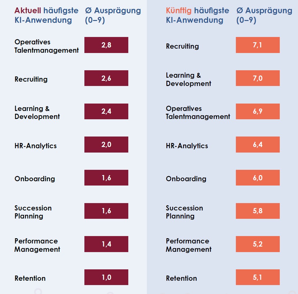 Derzeit beschränkt sich demnach die Nutzung von Künstlicher Intelligenz vor allem auf das operative Talentmanagement, das überwiegend Anwendungen betrifft, die nicht HR-spezifisch im eigentlichen Sinne sind, wie etwa Übersetzungen, Texterstellung, Inspiration bei konzeptioneller Arbeit. Die Befragten prognostizieren für die Zukunft eine generell sehr starke Nutzung, insbesondere im Recruiting und im Bereich Learning & Development.