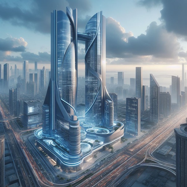 Zur Veranschaulichung von Texten sind Mitarbeitende jedoch nicht immer das Mittel der Wahl. Mit Tools wie DALL-E 3, Midjourney oder Adobe Firefly lassen sich hochwertige Visuals mithilfe der KI erstellen. Diese sogenannte Text-to-Image-AI erstellt Bilder aus Textbeschreibungen. Das Beispiel unten ist mit der Beschreibung „futuristisches Wolkenkratzer-Design in photorealistischem Stil“ entstanden: