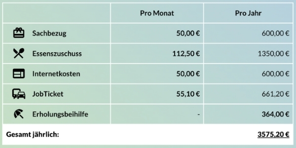 Die Kombinationsmöglichkeiten sind vielfältig: 50 Euro Sachbezug, 112,50 Euro Essenszuschuss, Deutschlandticket für 55,10 Euro, plus jährlich 600 Euro für Gesundheitsförderung. Das ergibt ein Jahrespaket von über 3.000 Euro, das beim Mitarbeiter größtenteils netto ankommt – bei deutlich geringeren Kosten für das Unternehmen.