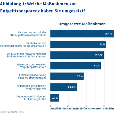 85 Prozent der Befragten gaben an, dass ihre Organisation sich der bevorstehenden EU-Richtlinie bewusst ist, jedoch haben sich erst 70 Prozent damit vertraut gemacht. Zwischen Bewusstsein und Umsetzung zeigt sich allerdings eine deutliche Diskrepanz. Zwar gaben jeweils über die Hälfte der Befragten an, ihre Organisation habe Handlungsbedarfe identifiziert, interne Diskussionen geführt oder Vergütungsstrukturen analysiert, doch ließ sich kein signifikanter Zusammenhang zwischen diesen Maßnahmen und einem höheren Transparenzniveau feststellen.