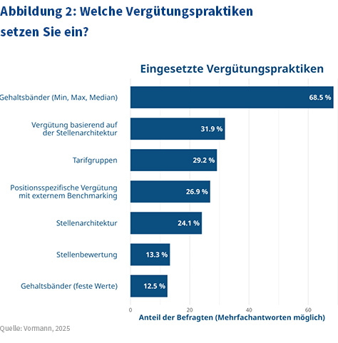 Nahezu 70 Prozent der befragten Organisationen nutzen Gehaltsbänder, um ihre Vergütungssysteme zu strukturieren. Allerdings stützt nur knapp ein Drittel von ihnen ihre Vergütungsstrukturen auf eine formale Stellenarchitektur. Organisationen mit etablierten Vergütungsstrukturen wie etwa Gehaltsgruppen, -stufen oder markt- oder tariforientierten Systemen zeigen kaum Unterschiede in der Entgelttransparenz zu Organisationen, die solche Strukturen nicht haben. Wesentlich ist jedoch, dass Organisationen mit Vergütungsstrukturen und Stellenarchitekturen signifikant höhere Transparenzwerte aufweisen als solche ohne diese Basis.