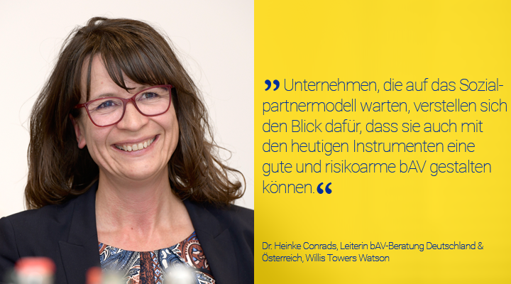 Trotzdem bleibt die Kernfrage: Warum hat sich in den letzten zwölf Monaten nichts getan? Ist die Tarifrente schon tot? Die Diskussionsteilnehmer vertreten unterschiedliche Meinungen. Ob und wann das Sozialpartnermodell seine Wirksamkeit entfaltet, ist noch nicht klar. Daher sollten Arbeitgeber nicht nur auf die Tarifrente warten, sondern mit den bestehenden Instrumenten eine gute und risikoarme bAV gestalten. Es gibt bewährte Lösungen, mit denen diese heute schon erfolgreicher vorankommen können.