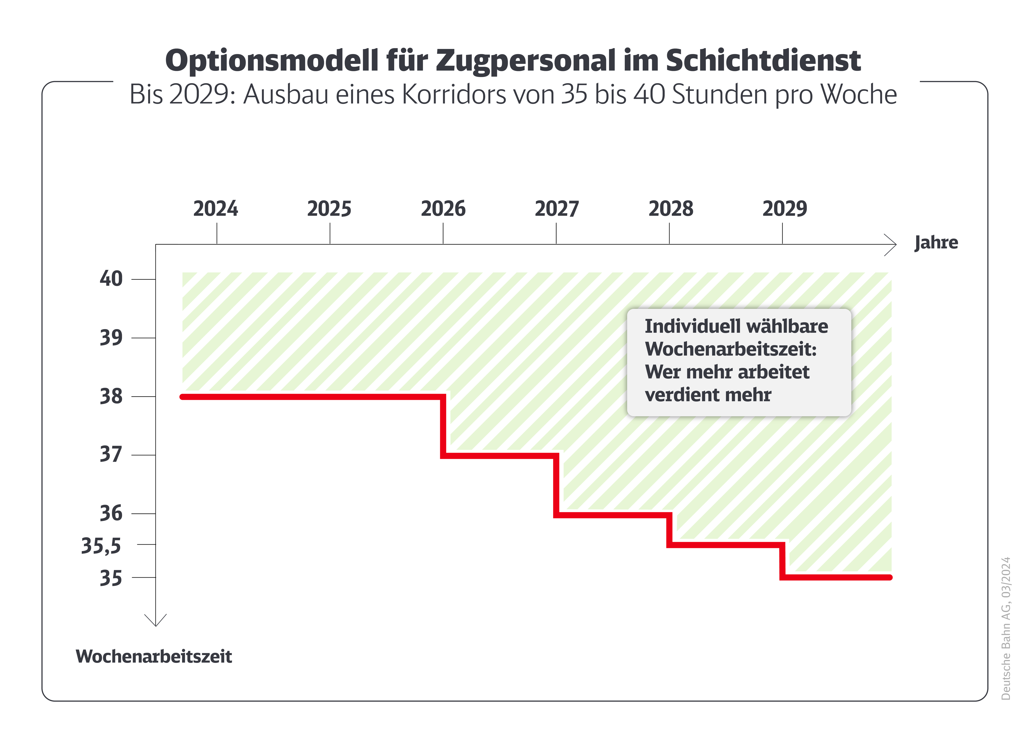 Demnach erfolgt die erste Reduzierung um eine Stunde auf 37 Wochenstunden ab 2026 noch automatisch, sollten die Beschäftigten vorher nicht anmelden, dass sie bei 38 Stunden bleiben wollen oder sogar länger arbeiten wollen. Bleiben sie bei 38 Stunden, erhalten sie noch einmal 2,7 Prozent mehr Entgelt. Anfang 2027 gibt es dann eine optionale Reduzierung auf 36 Stunden, ab 2028 auf 35,5 Stunden und ab 2029 dann 35 Stunden. Bei den letzten drei Stufen müssen sich die Beschäftigten selbst beim Arbeitgeber melden, wenn sie die Reduzierungsschritte wahrnehmen wollen. Sie können sich hingegen auch für gleichbleibende oder mehr Arbeitsstunden entscheiden – bis zu 40 Wochenstunden sind in diesem Wahlmodell möglich. Pro zusätzlicher oder gleichbleibender Arbeitsstunde erhalten die Beschäftigten demnach 2,7 Prozent mehr Lohn. Weitere Informationen in der Pressemeldung der Deutschen Bahn.