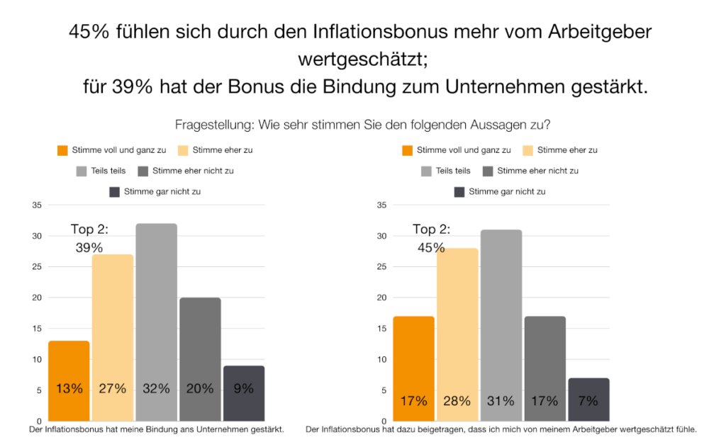 - Klar und wertschätzend kommunizieren: Menschen möchten verstehen, warum die Unternehmensleitung bestimmte Entscheidungen trifft. Eine offene Kommunikation über die Intention des Bonus als Unterstützung in Zeiten hoher Inflation schafft Vertrauen und verstärkt die bindende Wirkung.