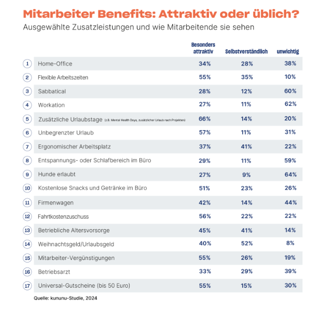 Andere Benefits halten sie zwar für attraktiv, erachten sie allerdings als selbstverständliche Leistungen ihres Arbeitgebers, darunter Urlaubs- und Weihnachtsgeld – dieses setzen 52 Prozent voraus, nur 8 Prozent halten es für unwichtig –, einen ergonomischen Arbeitsplatz (41 Prozent) sowie die betriebliche Altersvorsorge (bAV, 41 Prozent). Auch flexible Arbeitszeiten sowie die Möglichkeit, im Homeoffice zu arbeiten, erachten viele Beschäftigte als normal. Anders sieht es bei Universalgutscheinen aus: Diese finden 55 Prozent sehr attraktiv, und nur 15 Prozent empfinden sie als üblich.
