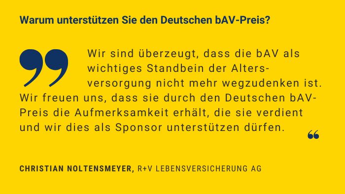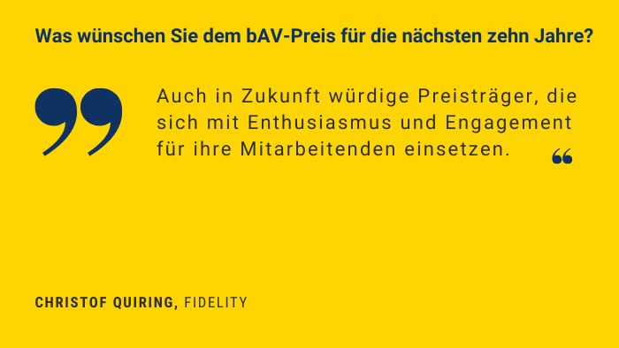 Thomas Jasper: Vor zehn Jahren haben alle Beteiligten den bAV-Preis mit viel Enthusiasmus gestartet. Heute ist er DER deutsche bAV-Preis. Wir haben eine namhafte, kenntnisreiche und engagierte Jury. Zudem genießen wir eine breite Unterstützung aus der bAV-Industrie. Vor allem sehen wir jedes Jahr fantastische Bewerbungen und Preisträger. Man kann mit Fug und Recht behaupten, dass der Preis seinem Namen voll gerecht wird.