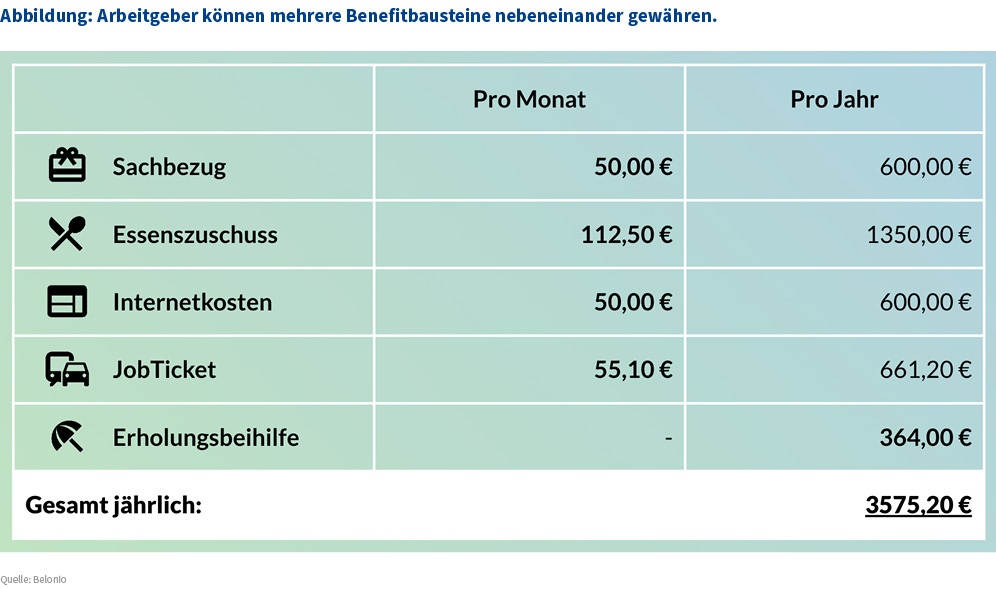 Ein praktisches Rechenbeispiel (siehe Abbildung): Ein Unternehmen kann einem Mitarbeiter monatlich 50 Euro Sachbezug, 112,50 Euro Essenszuschuss, 50 Euro Internetpauschale und 55,10 Euro für ein Jobticket gewähren – plus jährlich 364 Euro Erholungsbeihilfe für einen verheirateten Arbeitnehmer mit zwei Kindern. Das ergibt ein Jahrespaket von über 3500 Euro brutto, das dem Mitarbeiter oder der Mitarbeiterin größtenteils netto zugutekommt. Dieses Beispiel verdeutlicht: Mit einer durchdachten Kombination verschiedener Benefitbausteine können Unternehmen ihren Mitarbeitenden ein attraktives Paket anbieten, das weit über den 50-Euro-Sachbezug hinausgeht.